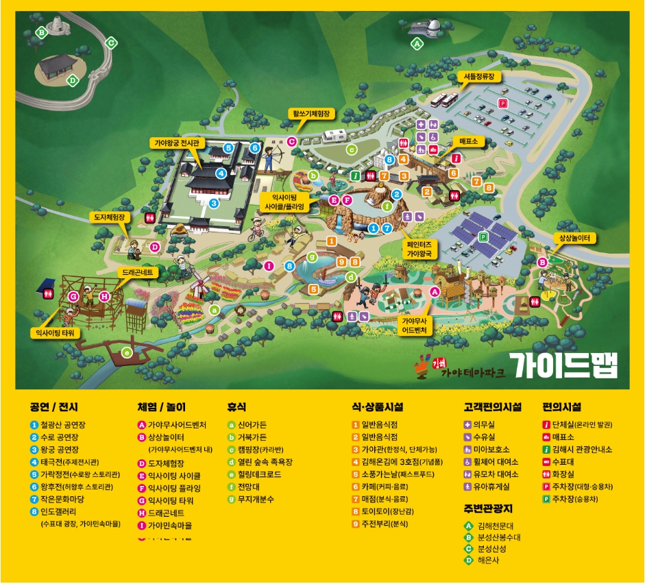 - 가야왕궁 전시관, 활쏘기 체험장, 도자기 공방, 어린이 어드벤처, 더블익스트림 등 70여 동의 콘텐츠가 밀집.