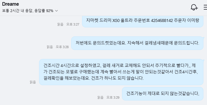 먼저 저는 구매후 3주정도는 잘 사용했는데, 어느날 갑자기 냄새가 나기 시작했고, 드리미 총판에 문의를 했습니다.
