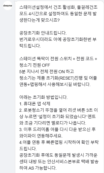 저와 같은 모델을 사용하는 드리미 로봇청소기의 제품 결함이 발견된다면 드리미총판에 문의하셔서 빠르게 AS 받으시면 좋을것같습니다.