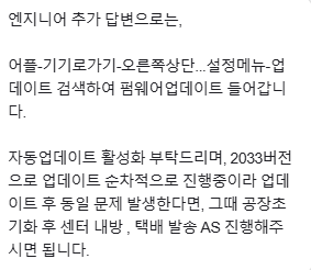 그래서 다시 총판에 문의를 했고, 총판의 답변은 제품 공장초기화와 어플리케이션 초기화 하여 재사용한뒤 동일문제 발생시 가까운 센터 내방 및 택배발송으로 AS 하여야 한다고 하더라구요..