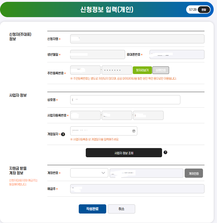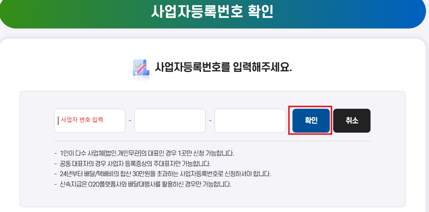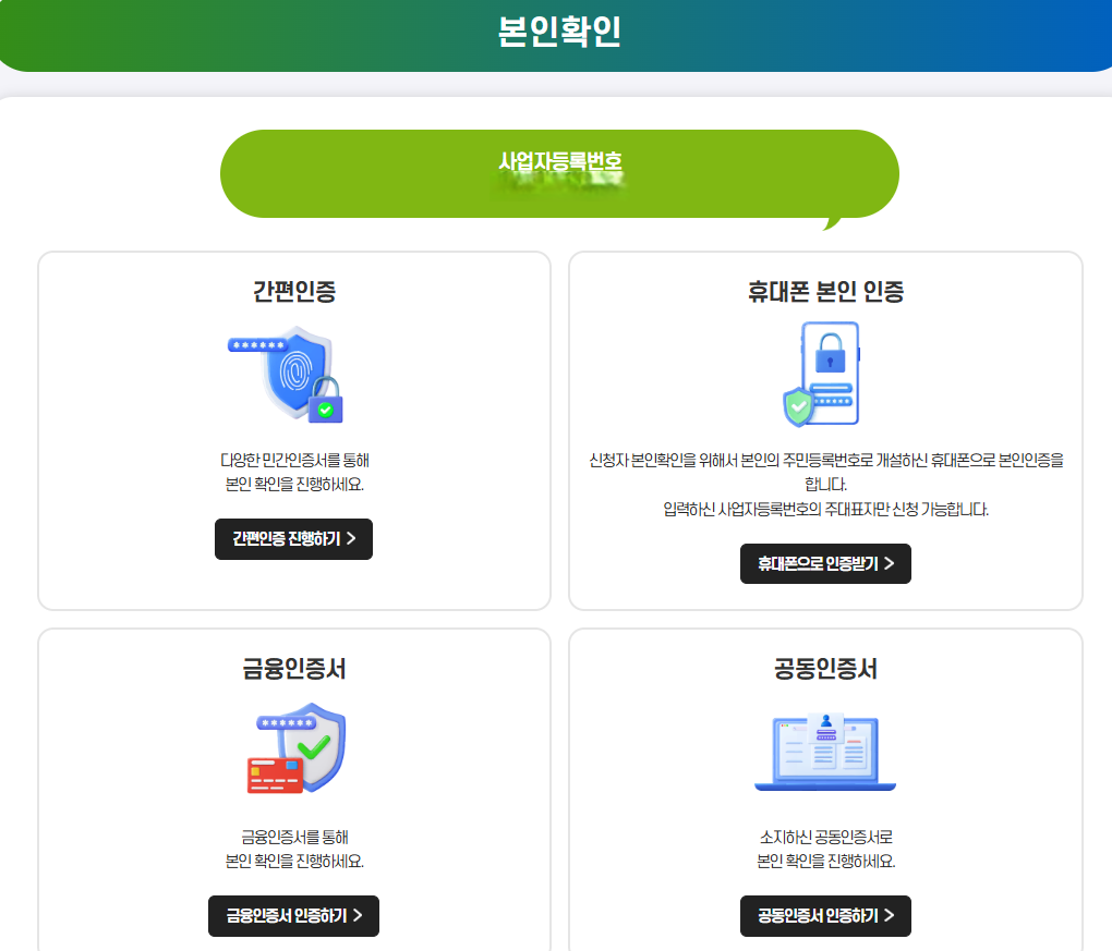 • 1인이 다수 사업체(법인·개인 무관)의 대표인 경우 1곳만 신청 가능, 공동대표가 운영하는 사업체는 주대표 1인만 신청 가능합니다.